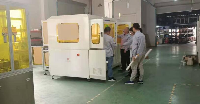 本次出貨的雙平臺全自動絲印機包括四個部分:上料結構區、CCD視覺對位區、全自動印刷區、制品搬送區另再配有連接隧道爐的自動流水線。